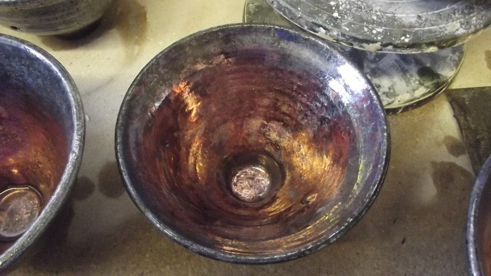 There's some nice crackle going on and copper lustres. It was a good day for Raku-ing- calm and still- so good conditions for the burn!